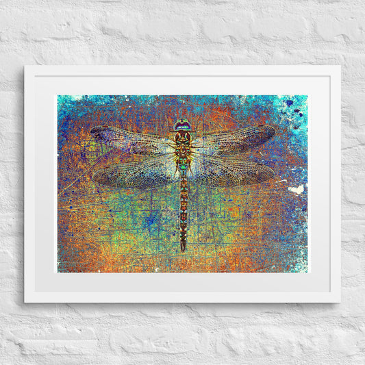 Gift for Dragonflies Lover, Dragonfly on Multicolor Background Paper Print Framed in an Ayous Wood Frame