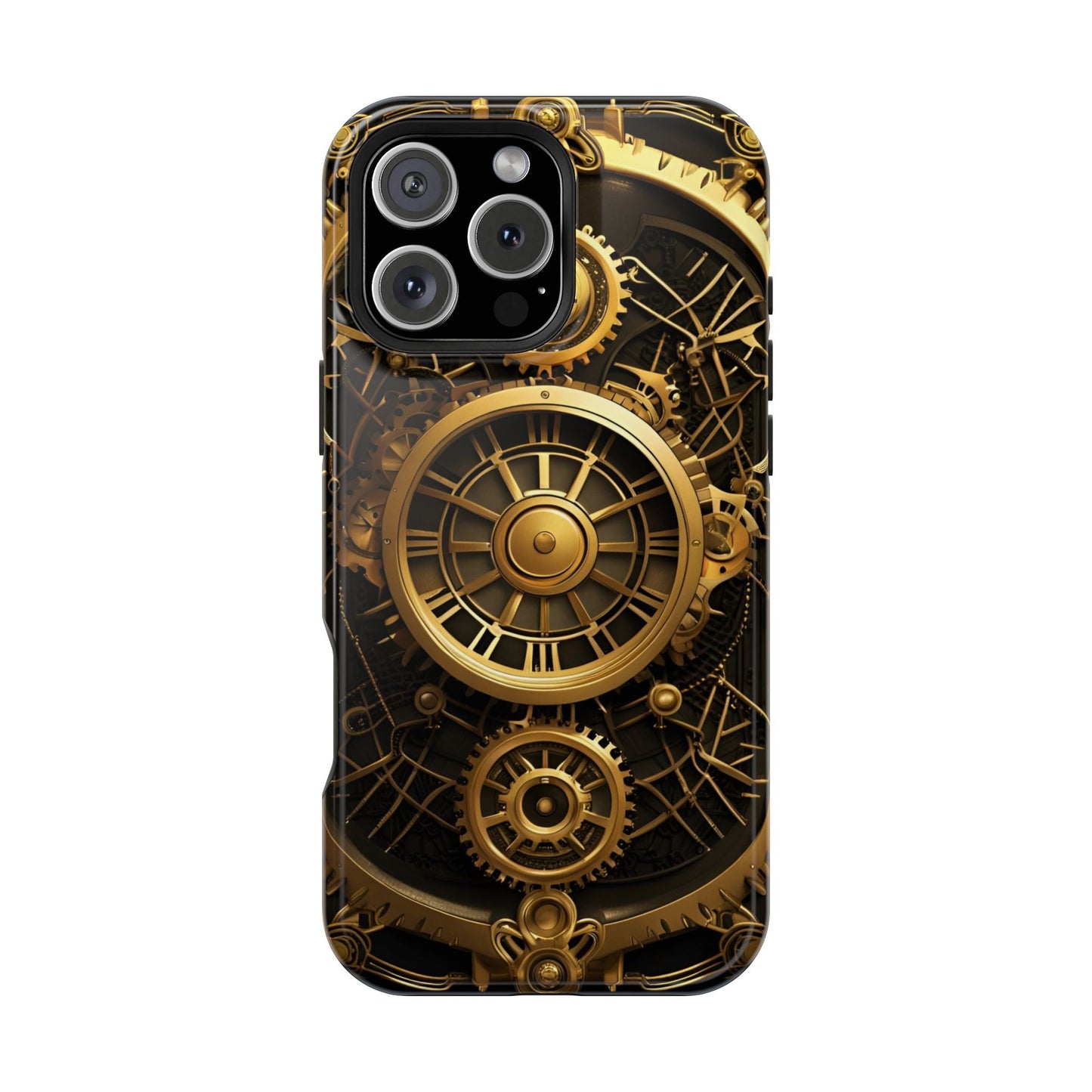 Magnetic Tough Cases for iPhone 16, Art Deco Themed Steampunk Gold and Copper Gears Panel Printed on Phone Case for iPhone 16