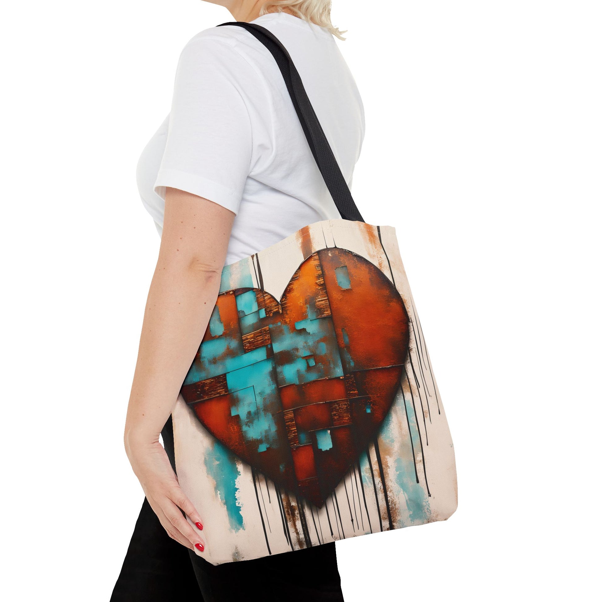 It features a large, fragmented heart that dominates the scene with a vibrant mix of rust and turquoise hues. Dripping paint and rectangular shapes add a modern, abstract feel to the composition.